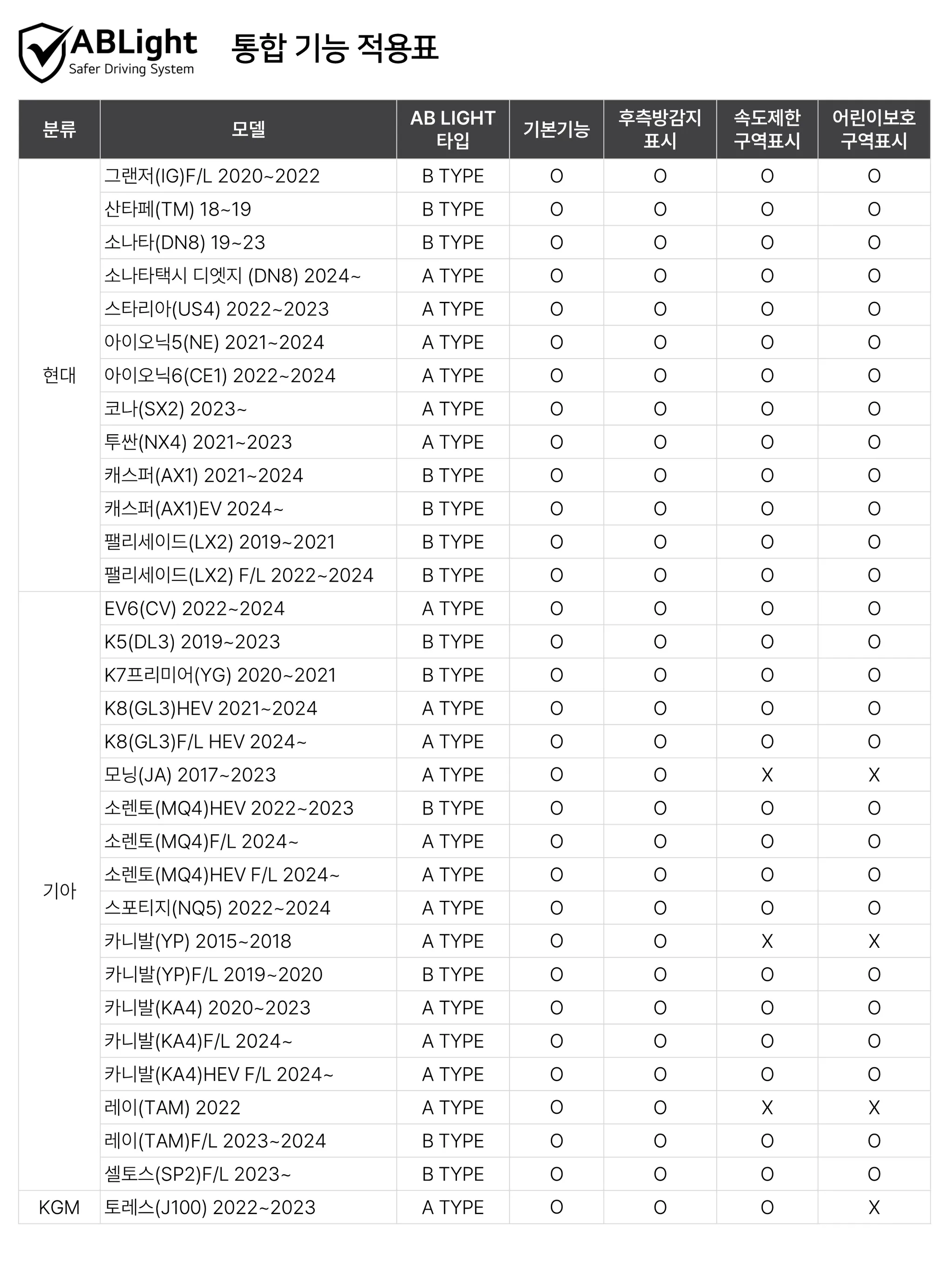 차량의 풀옵션 기준으로 기능적용표가 작성되어 있으며, 차량에 해당 옵션이 없으면 지원되지 않습니다.